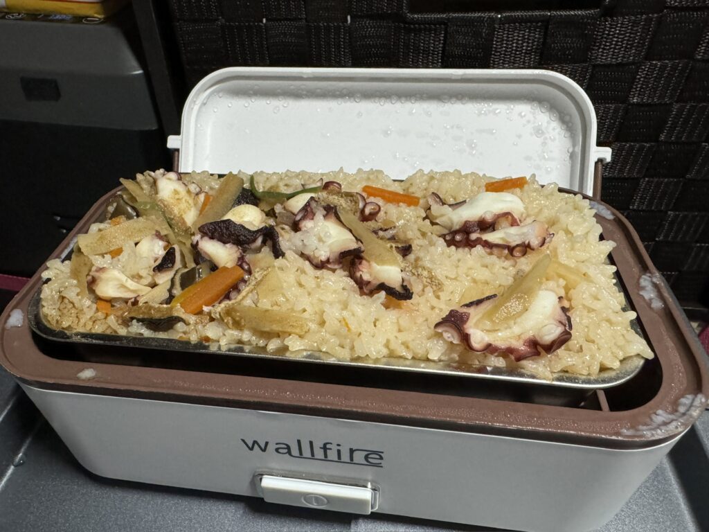 道の駅で手に入れた地元のタコ。 これをぶつ切りにして、出汁醤油と共に米の上へ。 固形燃料に火を灯すと、チロチロという微かな音と共に、車内に香ばしい匂いが充満し始める。 この「待つ時間」こそが、車中泊の贅沢だ。